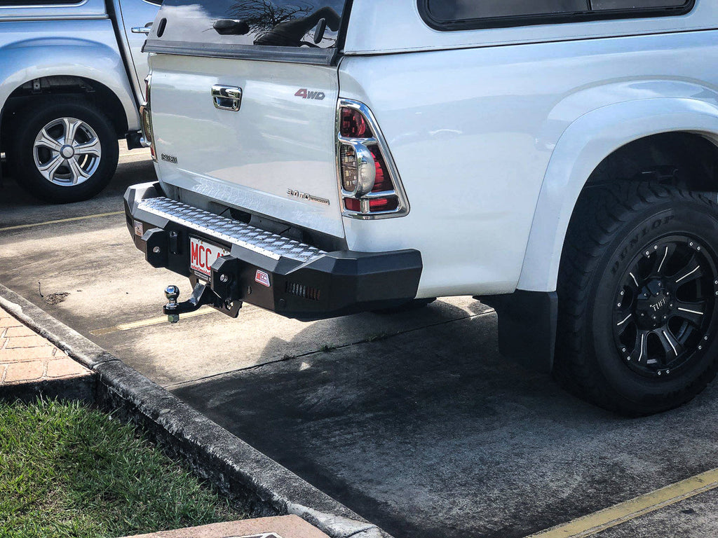 This BRAND NEW MCC ROCKER rear bar is constructed from extra thick steel with a heavy duty powder-coating offering great rear end protection for your vehicle. If upgrading to include the OPTIONAL swivel-arms, this rear bar provides great carrying capacity for either two spare wheels or a spare wheel & single/double jerry can holder. This rear bar is fully certified to be ADR & airbag compatible.